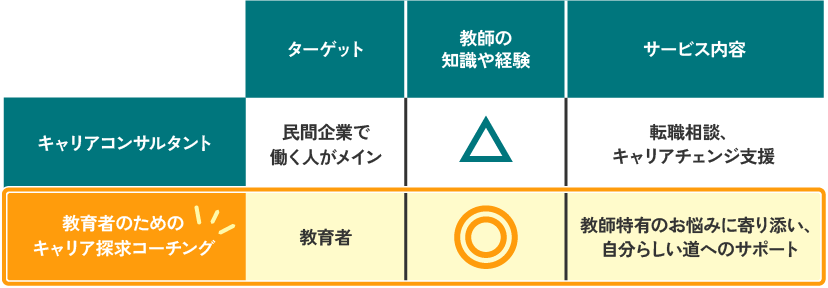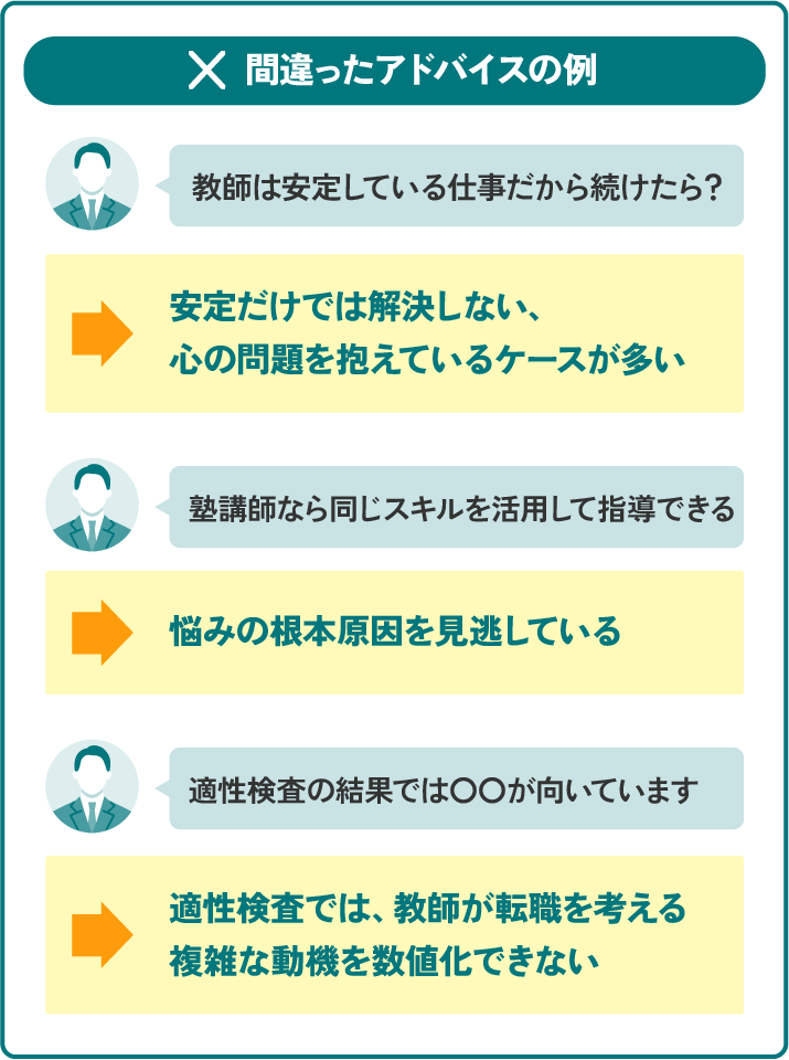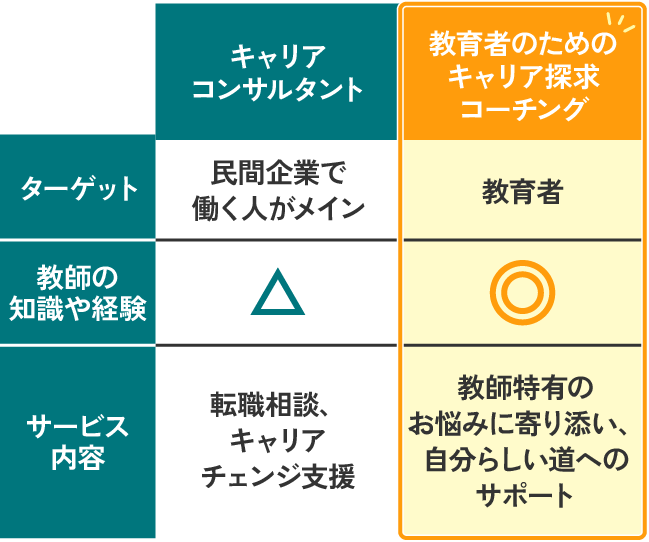 キャリアや仕事に迷いがある場合、まず思い浮かぶのが 「キャリアコンサルタント」への相談だと思います。転職エージェントや心理カウンセラーを頼る方もいます。 しかし、一般的なキャリア支援サービスでは、教師の悩みに寄り添えない場合があります。 キャリアコンサルタントは国家資格を持つ専門家のため、的確なアドバイスが期待できそうなのですが、 民間企業で働く人を対象にしたビジネス相談がメインのため、 教師の資格や経験を活かせるキャリアにはくわしくない、というケースがみられます。 そのため、民間企業で働く人を対象にしたビジネス相談では、なかなか答えを見つけられません。