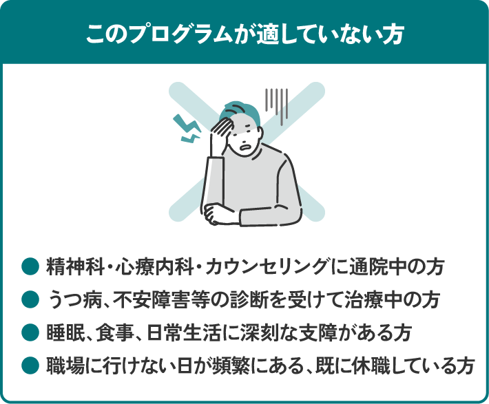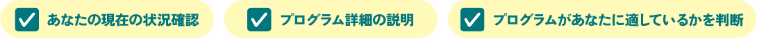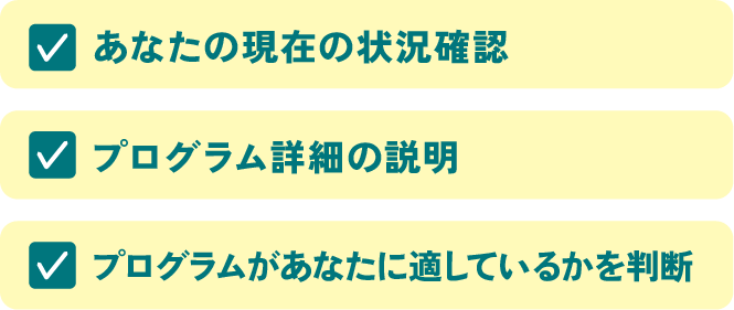 プログラムが適していないと判断した場合、 こちらからお断りする場合もございます。 ご了承ください。