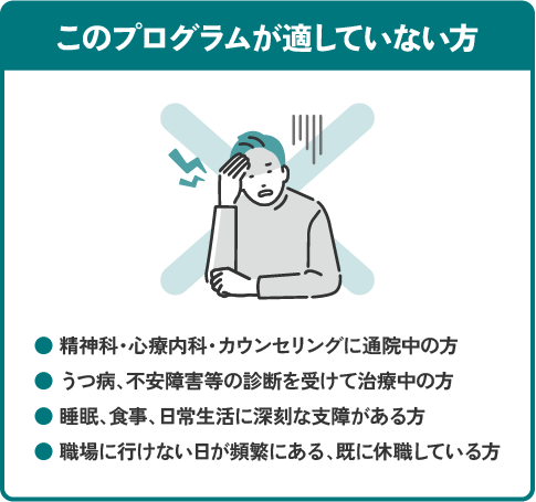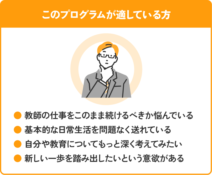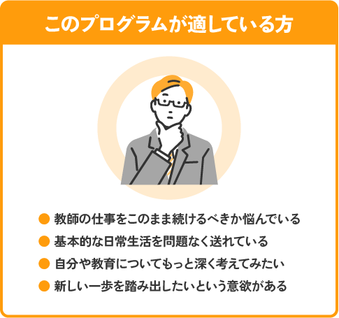「教育者のための自己探求コーチング」が適しているのは、教育の悩みを抱え、不安やトラブルを抱えながらも、日常生活をこなせている人です。朝ギリギリまで起きられない、食欲が落ちている、仕事にもプライベートにも意欲が湧かないなど、明らかに心身の健康が保たれていない場合は、まず医療機関へ相談されてください。症状が安定して心身の調子が整ってきてから、プログラムをご検討いただければ幸いです。