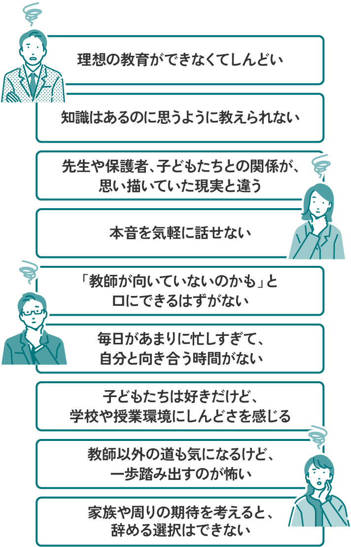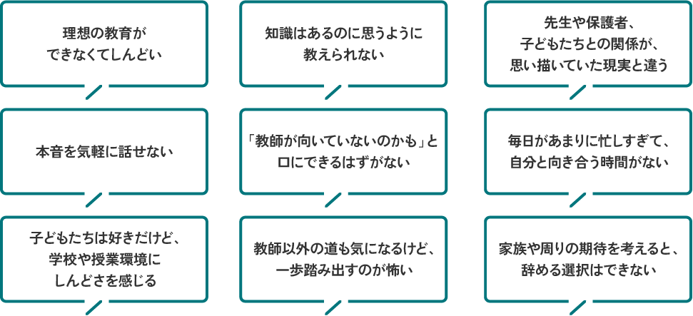 納得のいく仕事、やりがいを感じられる仕事をするなら、 教師を続ける場合も、教員以外のキャリアを築く場合も、 自分の気持ちや現状と向き合う時間が大切です。 期待や責任感に押しつぶされてしまう前に、 つらいけれど自分で選んだ道だから、と諦めてしまう前に、 自分が本当になりたい姿を一緒に探してみませんか?